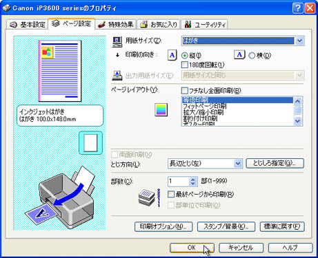 | はがきの文面を印刷するには、次のように操作します。 ※ここでは、Canon製のプリンタ「PIXUS iP3600」を例に解説します。なお、ドライバのインストールなどの準備はすでに終了し、プリンタが利用できる状態にあることとします。 |
