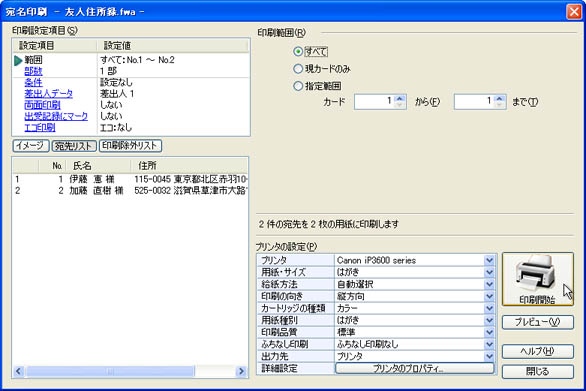 「文面印刷」ダイアログボックスの[印刷開始]ボタンをクリックします。 | ||||||||||||||||