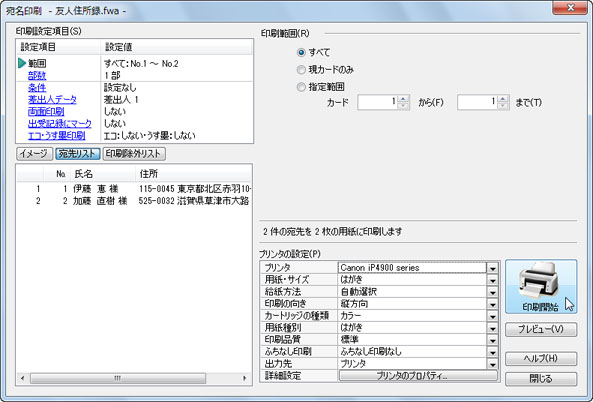「文面印刷」ダイアログボックスの[印刷開始]ボタンをクリックします。 | ||||||||||||||||