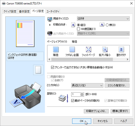 「ページ設定」タブをクリックし、[用紙サイズ(Z)]の一覧から「はがき」を選択します。 | ||||||||||||||||