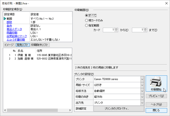 「文面印刷」ダイアログボックスの[印刷開始]ボタンをクリックします。 | ||||||||||||||||