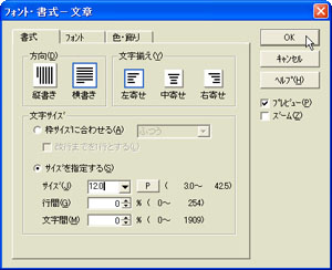 [縦書き]または[横書き]ボタンをクリックし、[文章枠を追加(W)]ボタンをクリックします。![]() |