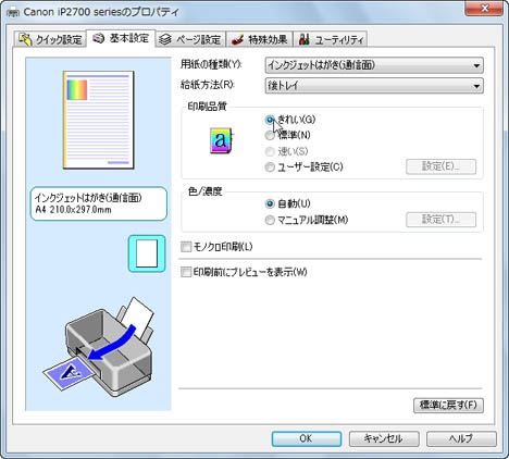「基本設定」タブをクリックし、[用紙の種類(Y)]の一覧から目的の用紙の種類を選択します。 | ||||||||||||||||||