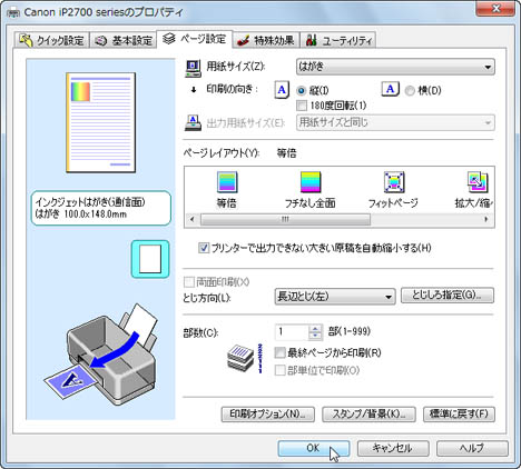 「ページ設定」タブをクリックし、[用紙サイズ(Z)]の一覧から「はがき」を選択して、印刷の向きを設定し、[OK]ボタンをクリックします。![]() |