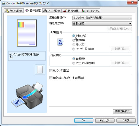 「基本設定」タブをクリックし、[用紙の種類(Y)]の一覧から目的の用紙の種類を選択します。 | ||||||||||||||||||