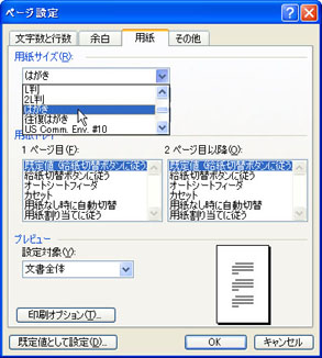 「用紙」タブをクリックし、[用紙サイズ(R)]の▼をクリックして、「はがき」を選択します。![]() |