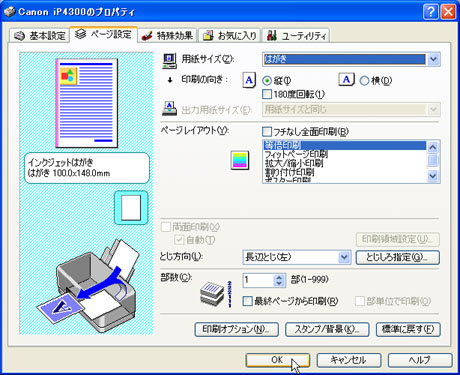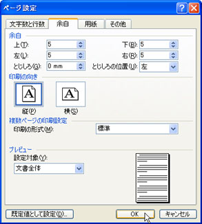 [印刷の向き]で[縦(P)]をクリックし、[OK]ボタンをクリックします。![]() |