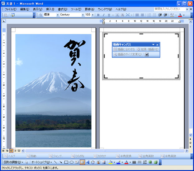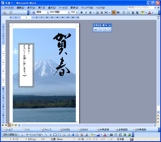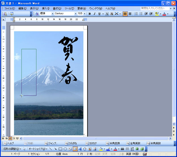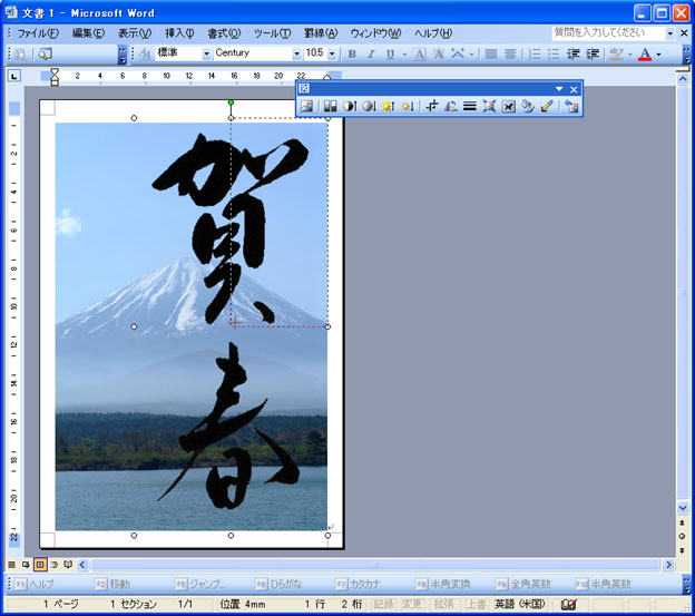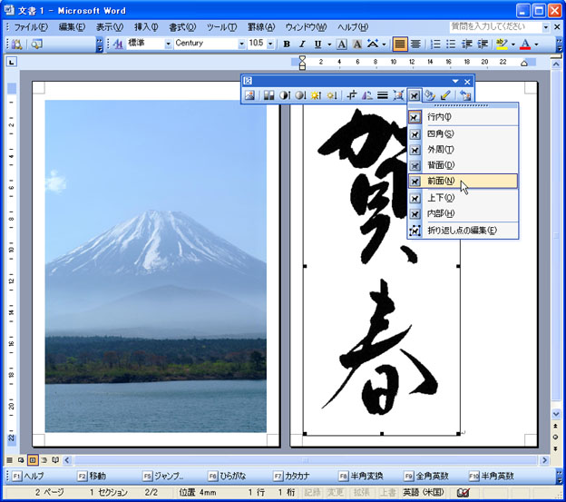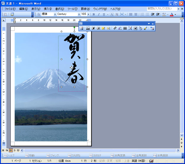 イラスト素材を選択して、「図」ツールバーの[テキストの折り返し]ボタンをクリックし、[前面(N)]を選択します。![]() |