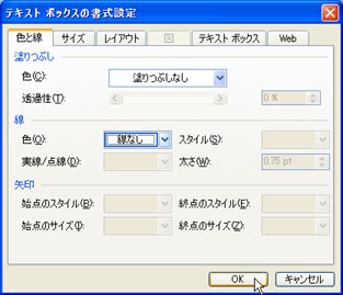 [線]の[色(O)]の▼をクリックして、「線なし」を選択し、[OK]ボタンをクリックします。![]() |