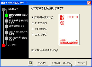 [年賀/暑中見舞い(Y)]をONにし、[次へ(N)>]ボタンをクリックします。 ※用途に応じて選択してください。 ![]() |