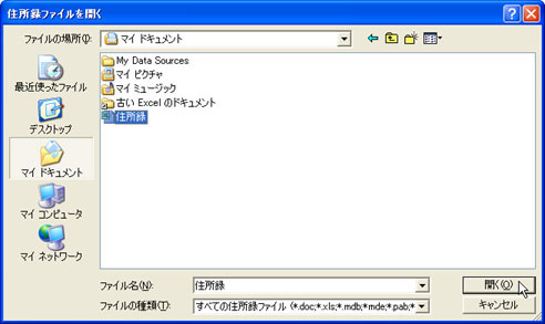 [ファイルの場所(I)]の▼をクリックして、保存場所を選択し、住所録のファイルを選択して、[開く(O)]ボタンをクリックします。![]() |