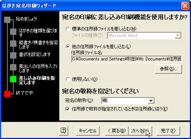 [宛名の敬称(C)]の▼をクリックして、敬称を選択し、[次へ(N)>]ボタンをクリックします。![]() |
