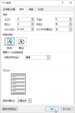「余白」タブをクリックし、[余白]の[上(T)][下(B)][左(L)][右(R)]にそれぞれ数値を入力し、余白を設定します。[印刷の向き]を選択して[OK]ボタンをクリックします。![]() |
