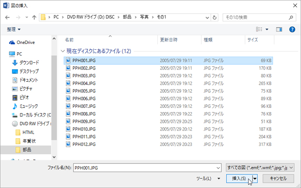 左側の欄で本書の付属DVD-ROMを選択し、目的のデータが保存されているフォルダをダブルクリックで表示して、目的の画像を選択し、[挿入(S)]ボタンをクリックします。![]() |