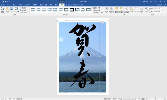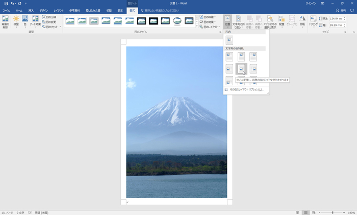 [位置]をクリックし、[文字列の折り返し]の中の「中心に配置し、四角の枠に沿って文字列を折り返す」を選択します。 ※「書式」タブが表示されていないときは、画像を選択してから「書式」タブをクリックしてください。 ![]() |