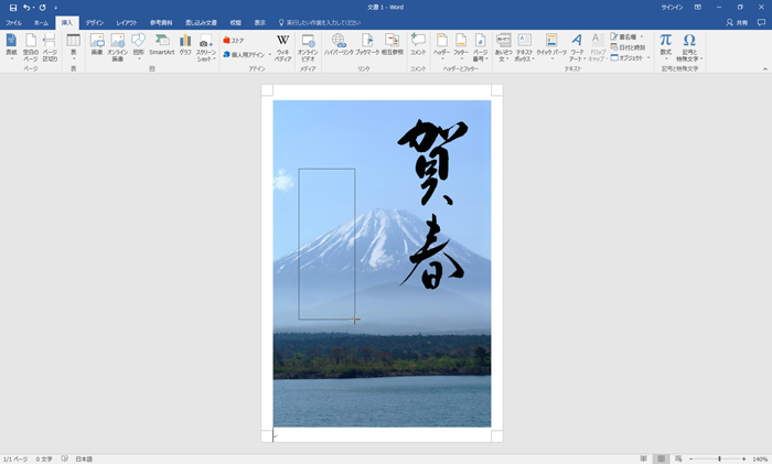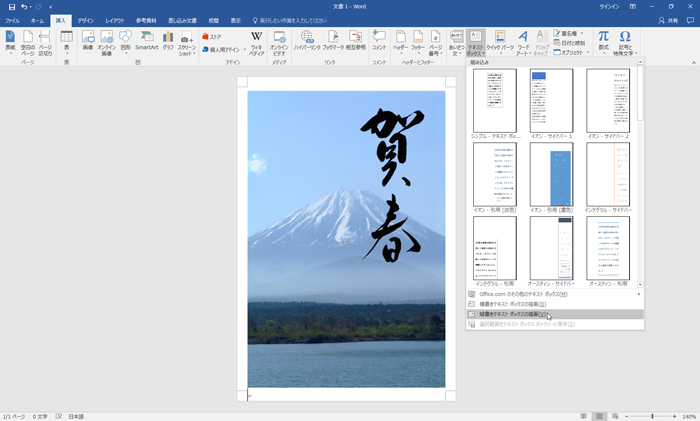 「挿入」タブをクリックし、[テキストボックス]をクリックしして[縦書きテキストボックスの描画(V)]を選択します。横書きにしたい場合は[横書きテキストボックスの描画(D)]を選択してください。![]() |