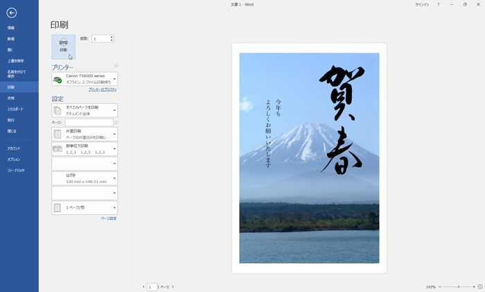 | はがきの文面を印刷するには、次のように操作します。 ※ここでは、Canon製のプリンタ「PIXUS TS9030」を例に解説します。なお、ドライバのインストールなどの準備はすでに終了し、プリンタが利用できる状態にあることとします。 |