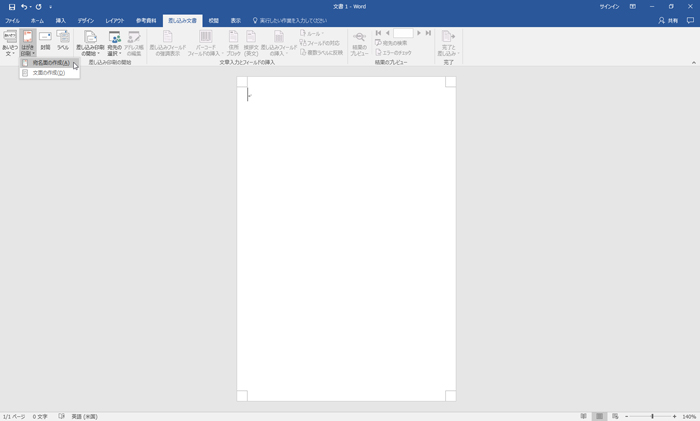 画面上で何も選択していない状態で、「差し込み文書」タブをクリックし、[はがき印刷]をクリックして[宛名面の作成(A)]を選択します。![]() |