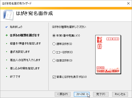 [年賀/暑中見舞い(Y)]をONにし、[次へ(N)>]ボタンをクリックします。 ※用途に応じて選択してください。 ![]() |