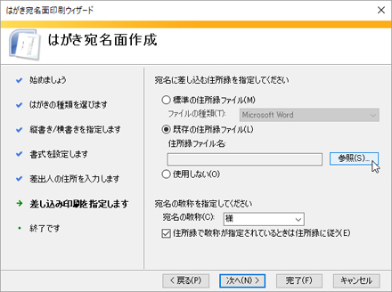 宛名の敬称を必要に応じて変更し、[次へ(N)>]ボタンをクリックします。![]() |