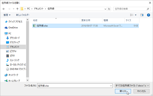 住所録のファイルの保存場所を選択し、ファイルを選択して、[開く(O)]ボタンをクリックします。![]() |