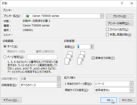 [プリンタ名(N)]でプリンタを選択し、[OK]ボタンをクリックします。![]() |