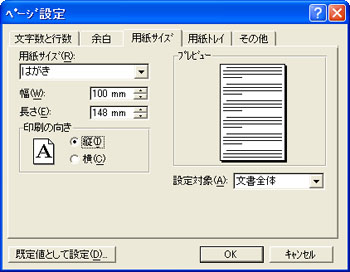 「ページ設定」タブをクリックし、[用紙サイズ(Z)]の一覧から「はがき」を選択し、[OK]ボタンをクリックします。![]() |