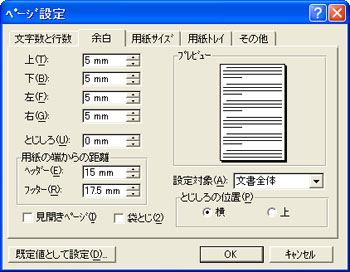 「余白」タブをクリックし、[上(T)][下(B)][左(F)][右(G)]にそれぞれ数値を入力して余白を設定し、[OK]ボタンをクリックします。![]() |