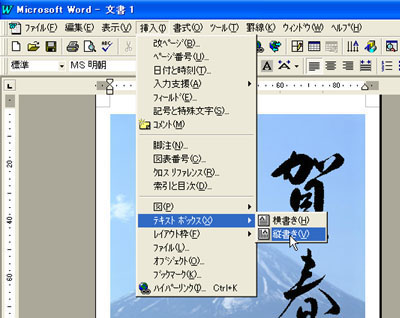 [挿入(I)]→[テキストボックス(X)]→[縦書き(V)]を選択します。横書きにしたい場合は、[横書き(H)]を選択します。![]() |