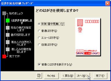 [年賀/暑中見舞い(Y)]をONにし、[次へ(N)>]ボタンをクリックします。 ※用途に応じて選択してください。 ![]() |