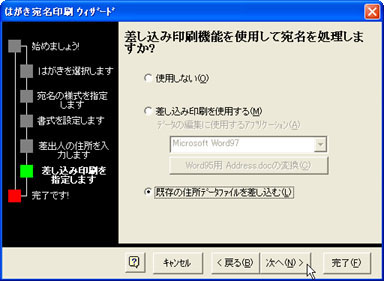 [既存の住所データファイルを差し込む(L)]をONにして、[次へ(N)>]ボタンをクリックします。![]() |